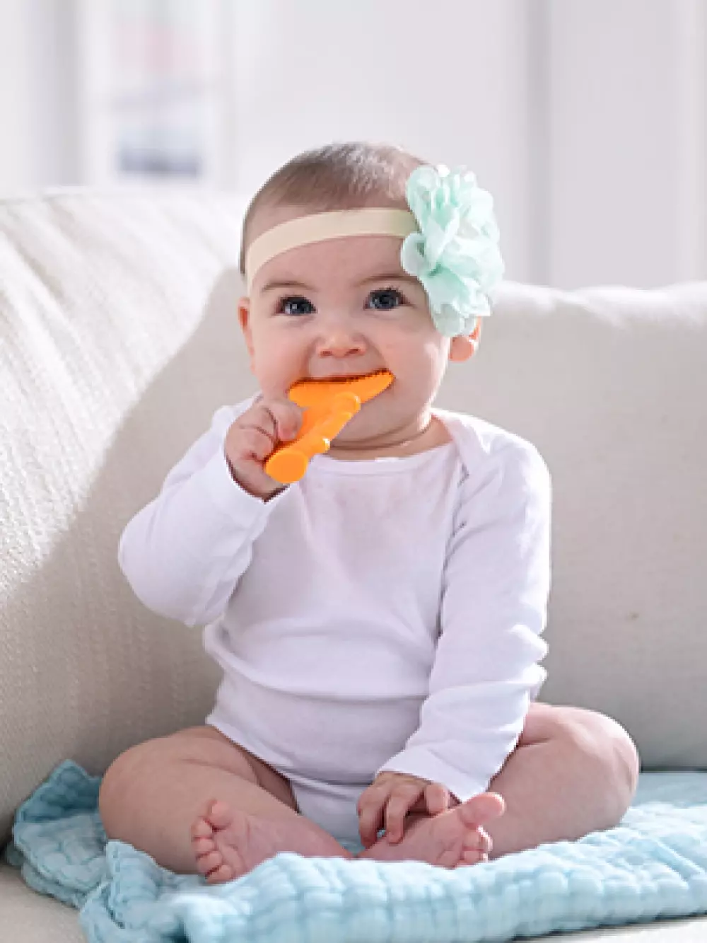 Mordedor de bebé seguro e fácil de mastigar mesmo depois de frio. Pode ser lavado na máquina de lavar louça, aquecido no microondas e arrefecido no congelador.