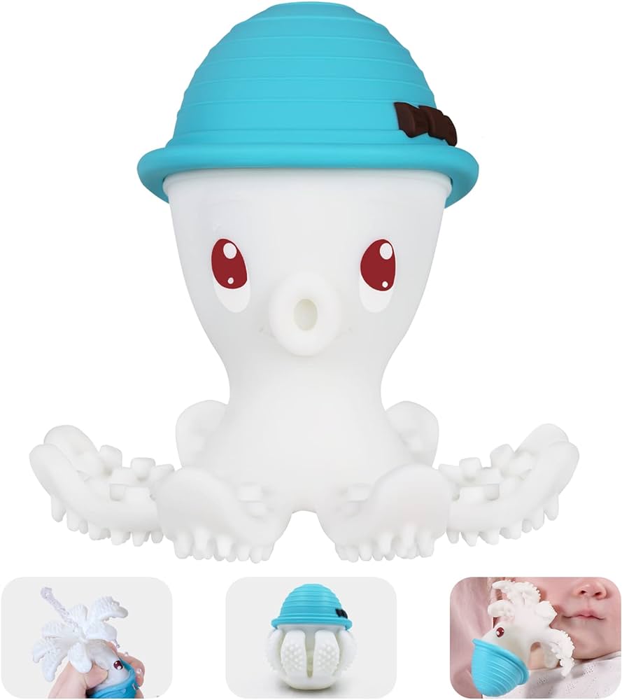 Mordedor de silicone feito em versão 3D. É o primeiro mordedor perfeito para bebé porque é projetado de forma que o seu filho não se possa engasgar. Um lindo mordedor de polvo bebé se tornará no amigo favorito durante a dentição. Seu design proporciona à criança diversas formas de brincar. A superfície lisa pode ser usada para sugar, pode fazer uma bola com ela. Oito tentáculos nos quais o mordedor foi equipado têm saliências que servem como mordedor e escova de dentes. A forma e o tamanho corretos permitem que a criança o agarre facilmente.